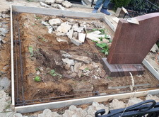 Сначала мы разбираем гранитный цоколь, разбиваем находящийся под ним бетон. В получившуюся траншею укладываем арматуру, по периметру участка возводим опалубку.