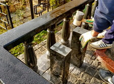 Создаём ограждение. Монтируем заранее вырезанные балясины, на них сверху приклеиваем гранитные балки. Получившееся ограждения имеет вид перил.