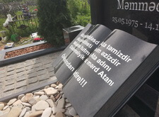 Собираем лавочку, устанавливаем её напротив надгробья. Цветник у подножья мемориальной стелы наполняем светлыми камнями. Под полукруглую арку памятника укрепляем вырезанную из гранита фигуру полумесяца.